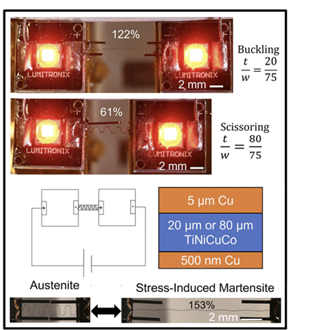 alloys is leveraged for bi-directional actuation with TiNiHf/SiO₂/Si composites. The shape memory properties of magnetron sputtered