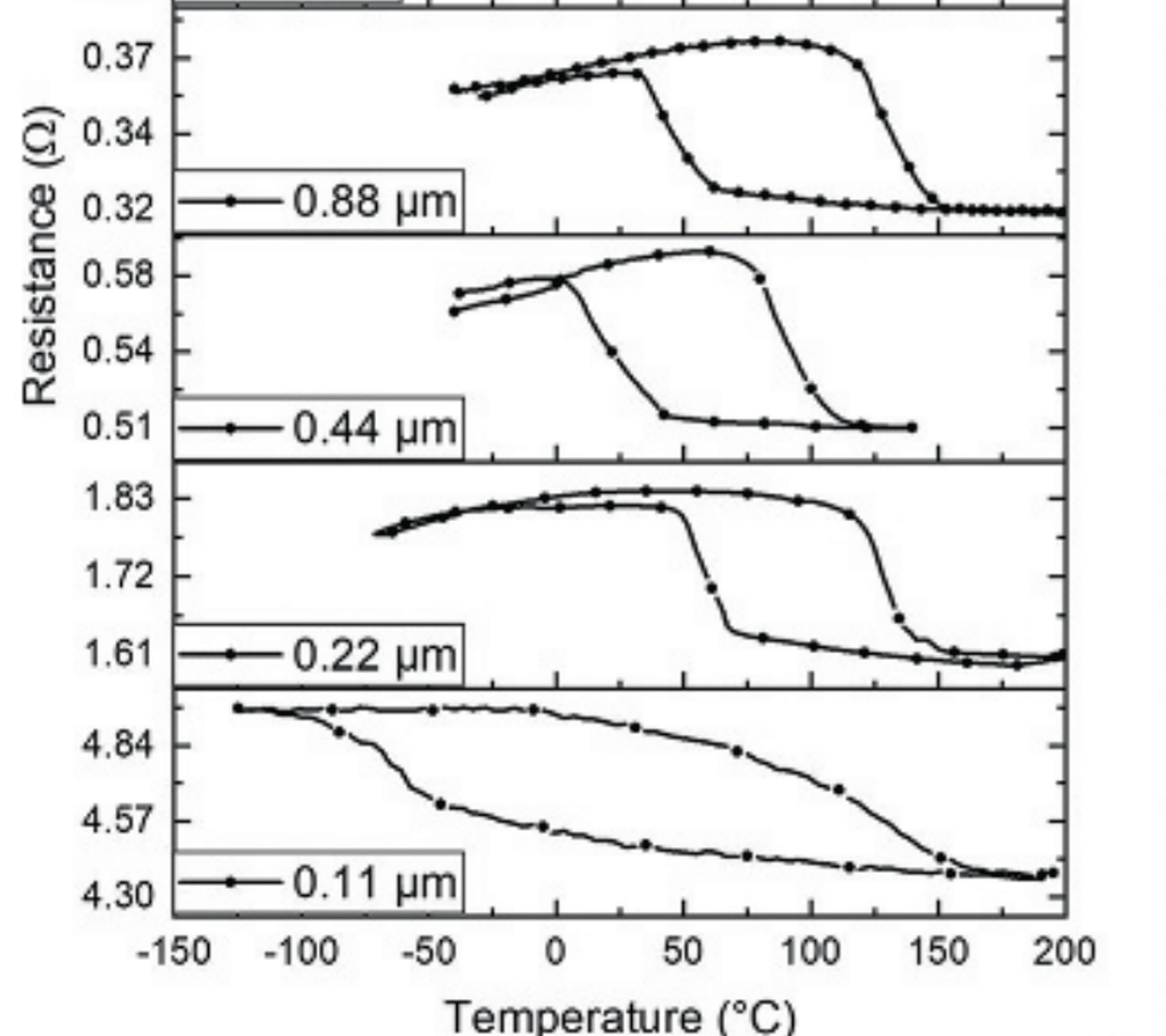 Ti₄₀.₄Ni₄₈Hf₁₁.₆ films annealed at 635°C – 5 min are influenced by film thickness and the underlying substrate.